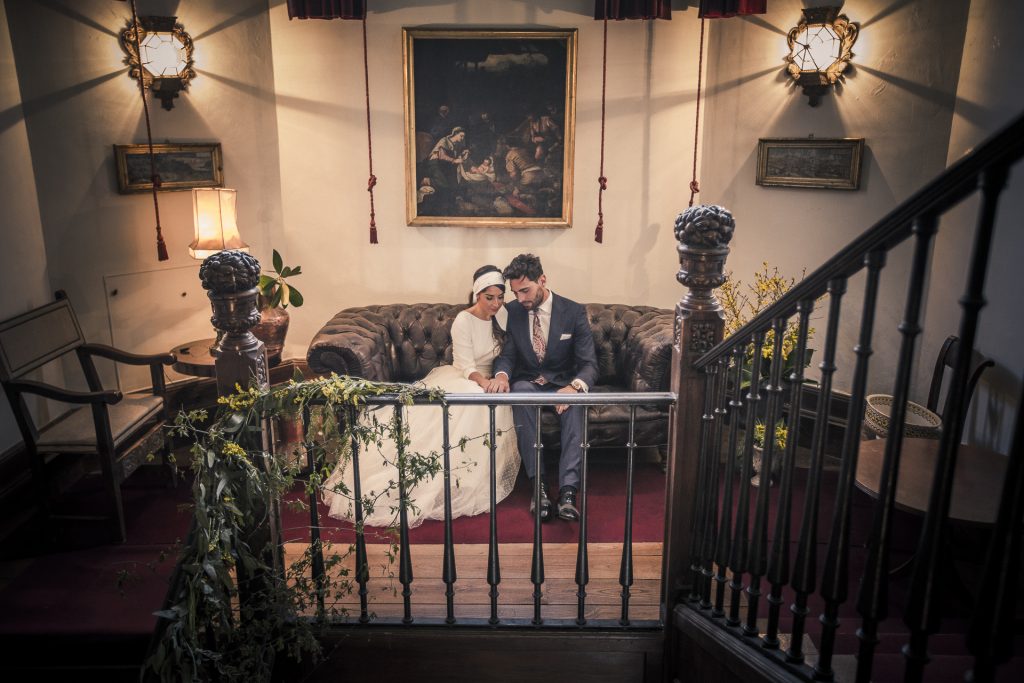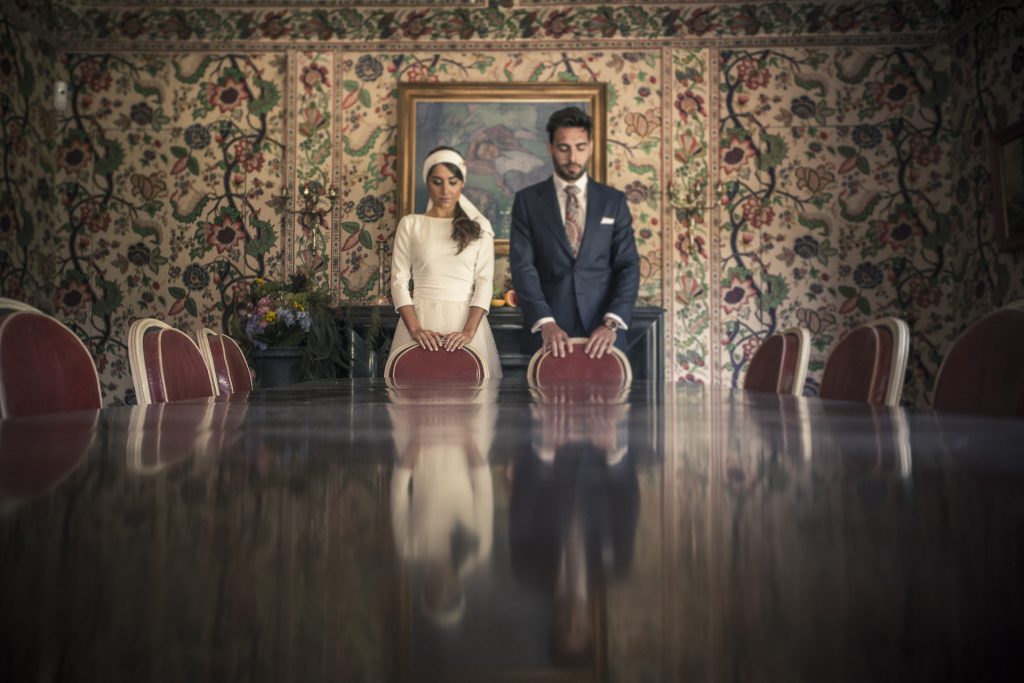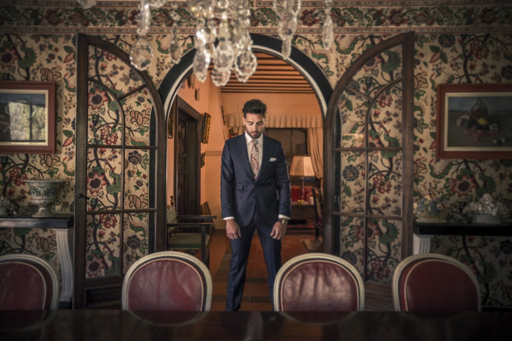Destacar también al novio, vestido de Oskar Sastre, lleno de elegancia y aplomo, casi diplomático, que se refleja en toda la recreación decorativa, de maquillaje, peluquería, joyería…etc.