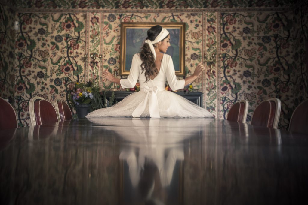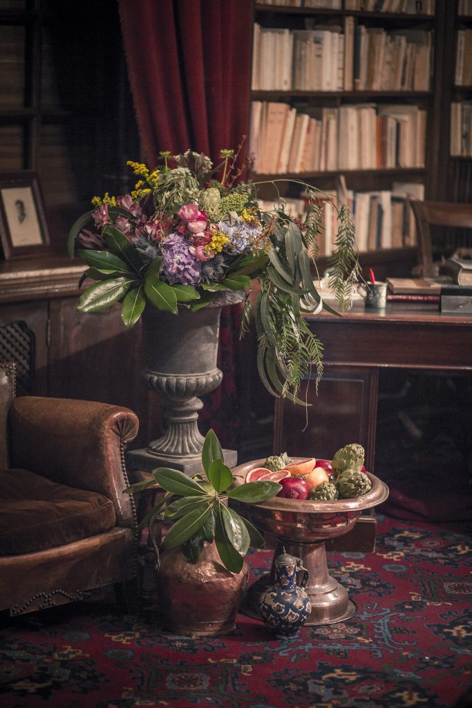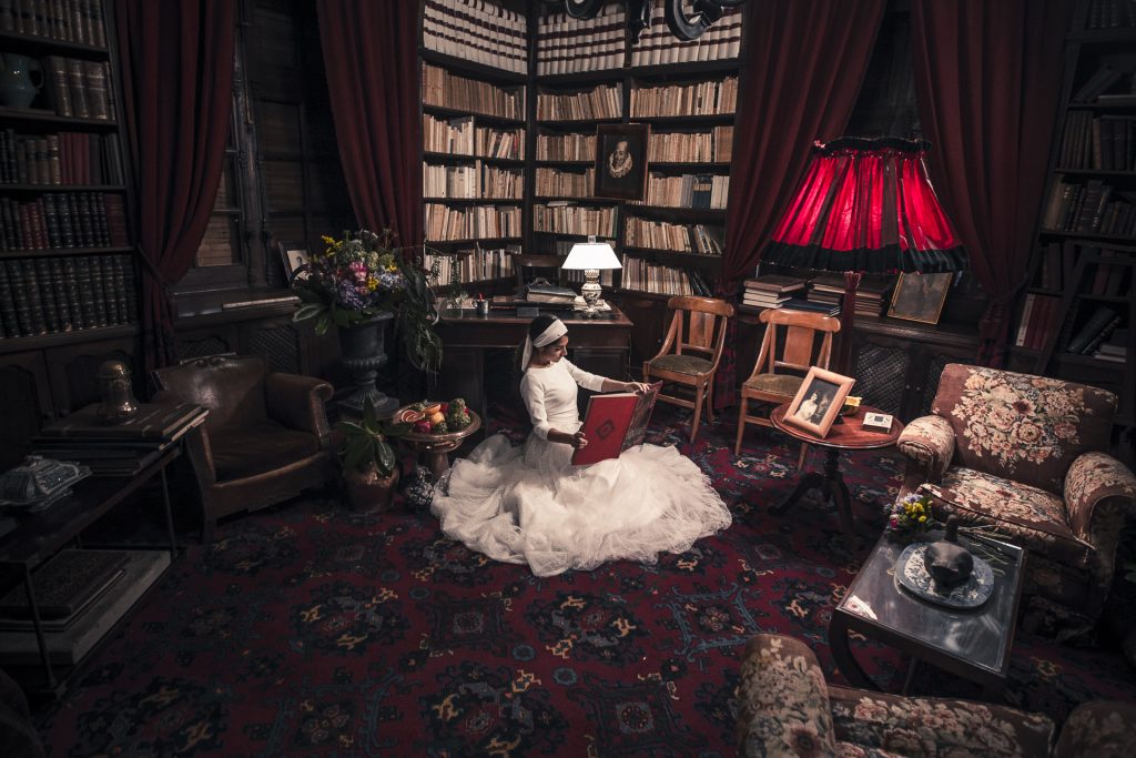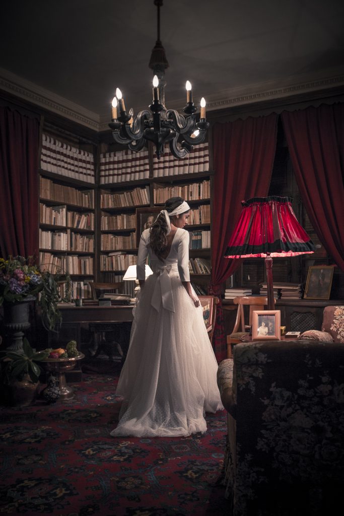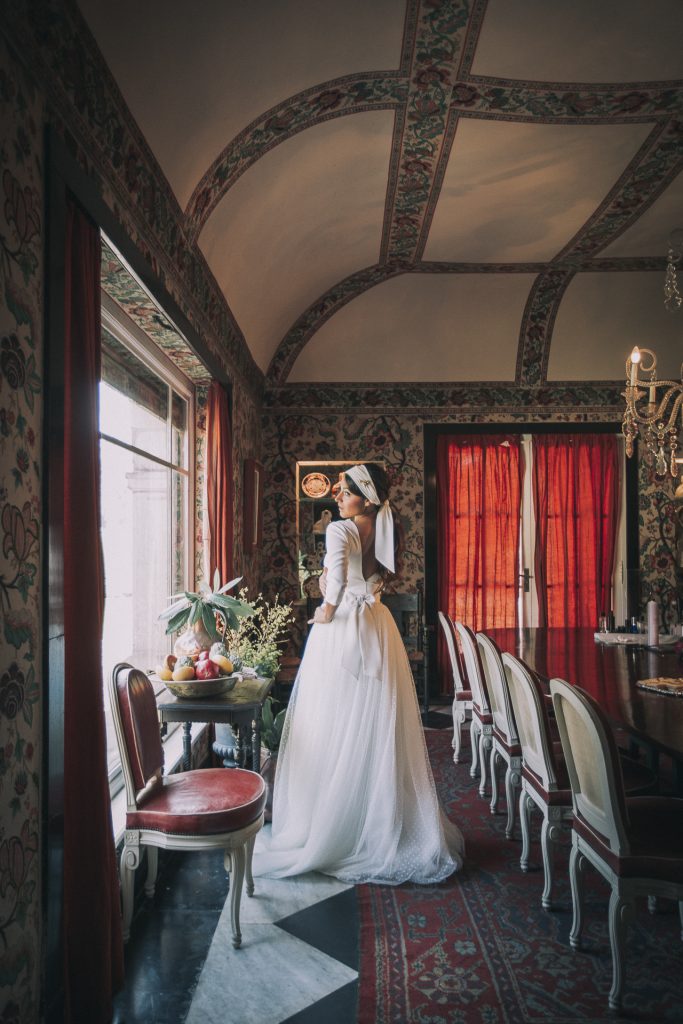 La biblioteca del palacio era el rincón perfecto para mostrar a una novia relajada y tranquila rodeada de grandes clásicos en un mundo de ensueño. Un pequeño bodegón muy potente que recordaba a las meriendas en antiguos salones. En la misma línea se trabajó en el comedor con las frutas y centros muy señoriales. El ramo de novia era un mosaico de color, a juego del resto de decoración y en armonía con el look creado para el interior.
