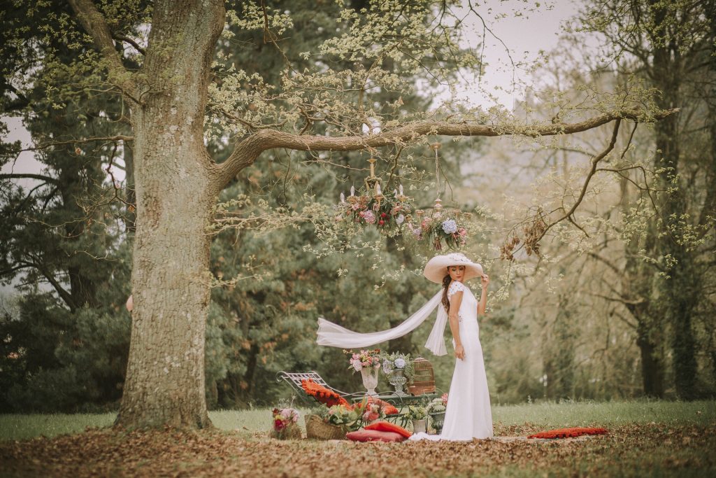 En el jardín, se introdujeron unas pinceladas de decoración de interiores con lámparas y alfombras, mezclada con hamacas y otros elementos de exterior que recuerdan a un picnic loco de algún cuento, como en Alicia en el país de las maravillas. El cesto con flores y el rincón de las escaleras nos lleva a esas tardes de primavera tardía después de un paseo por el bosque. El ramo en este caso, como el estilismo, está lleno de desenfado y clase, ambos unidos y totalmente exento de artificio.